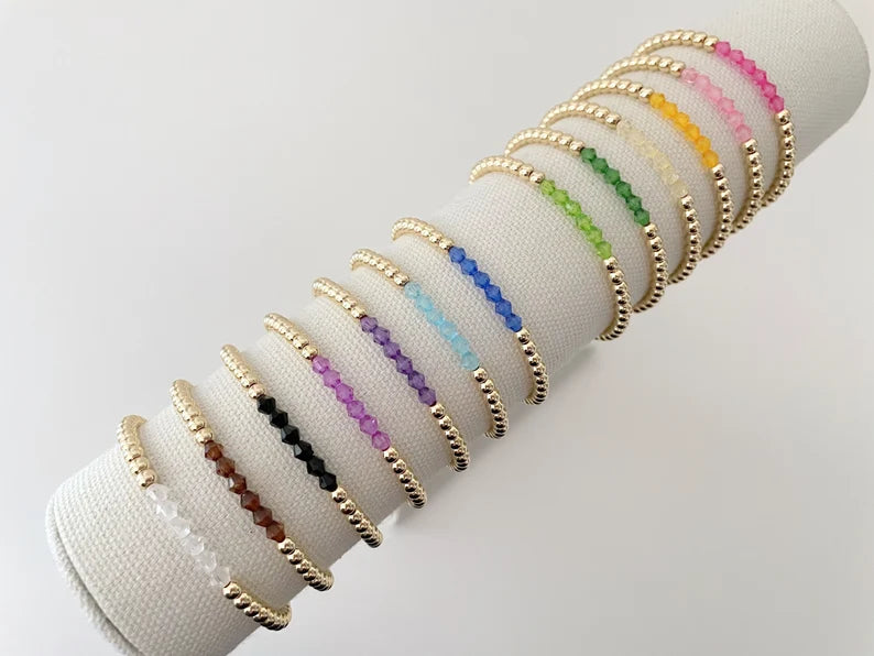 - one 14k gold plated stacking bracelet with 4mm crystal colored beads