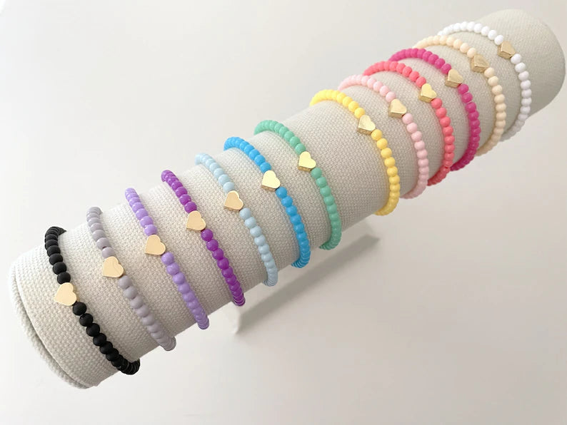 - one 14k gold heart charm stacking bracelet with 4mm round plastic beads