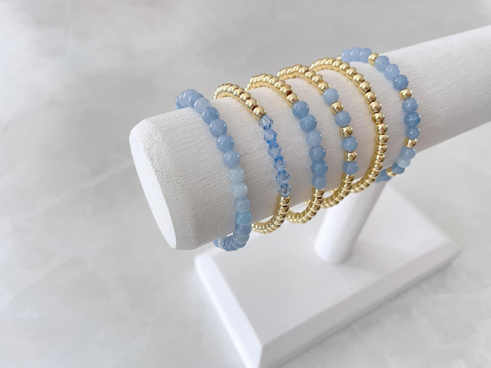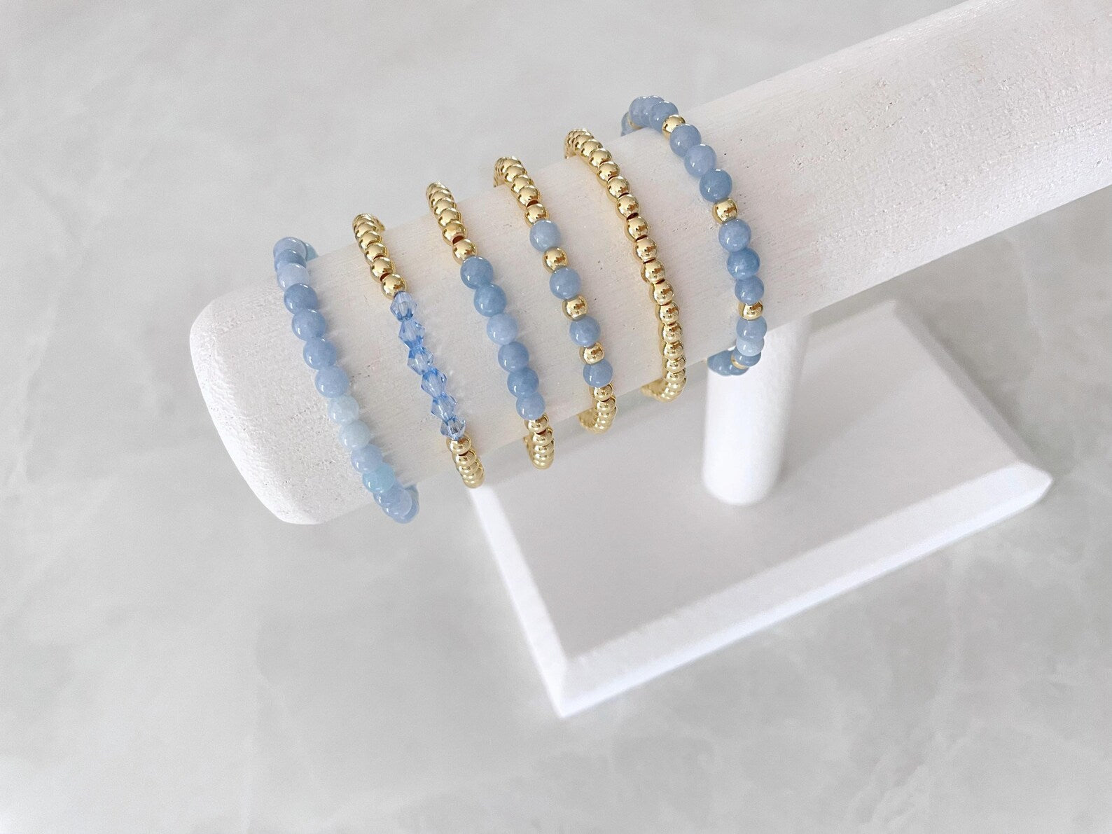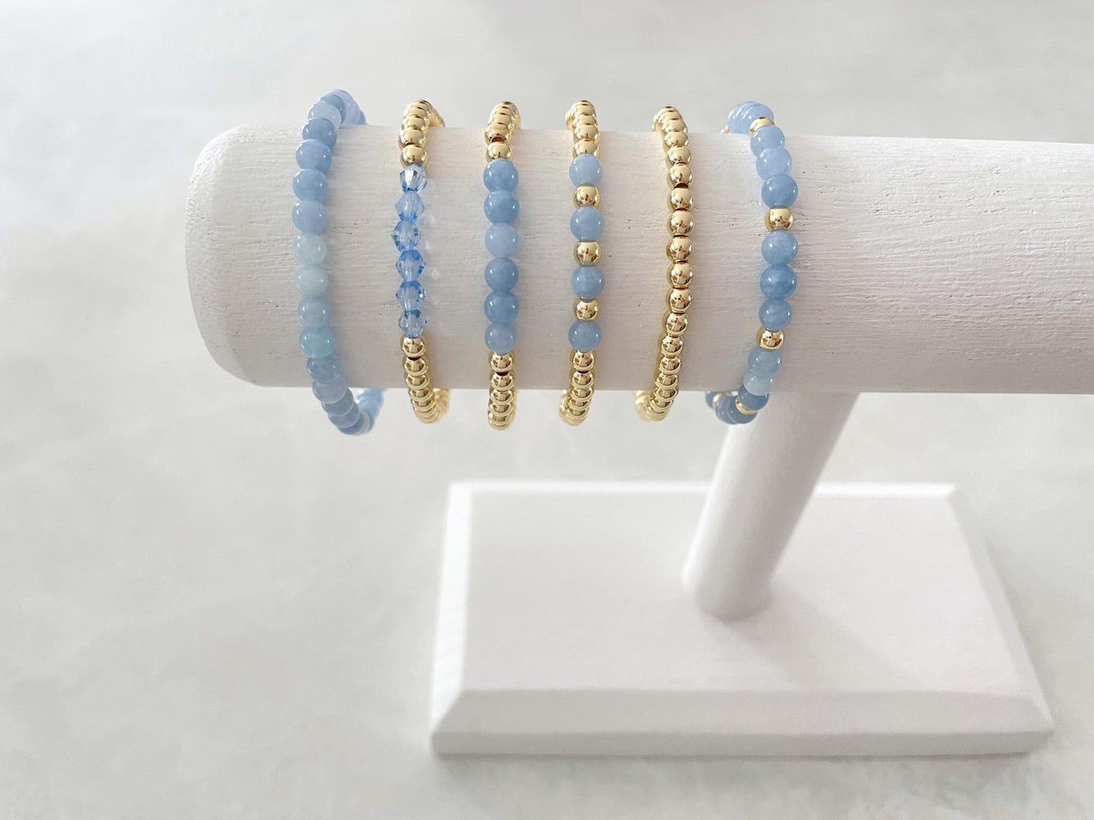 - one bracelet made with 4mm 14k gold plated beads with 4mm aquamarine stone beads