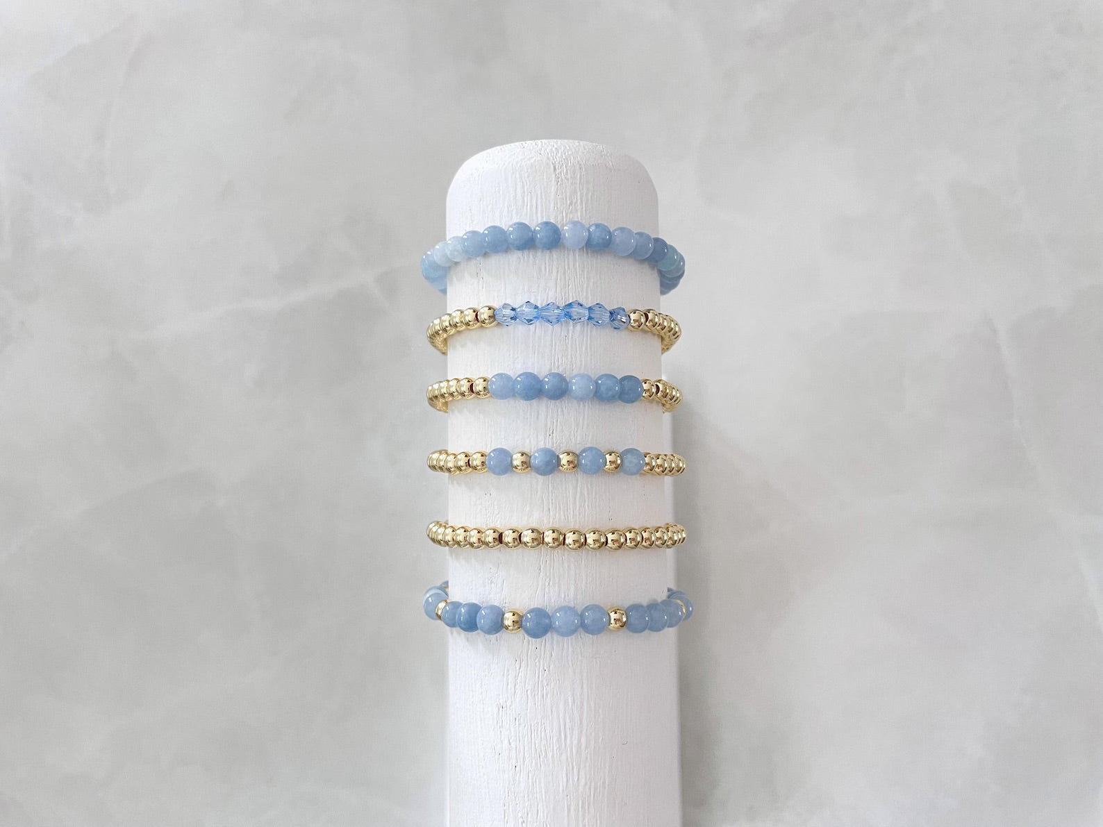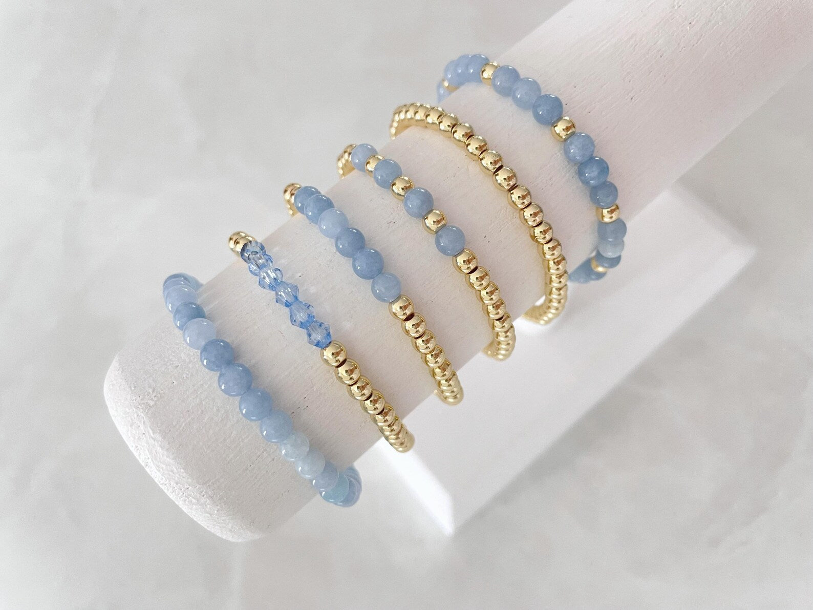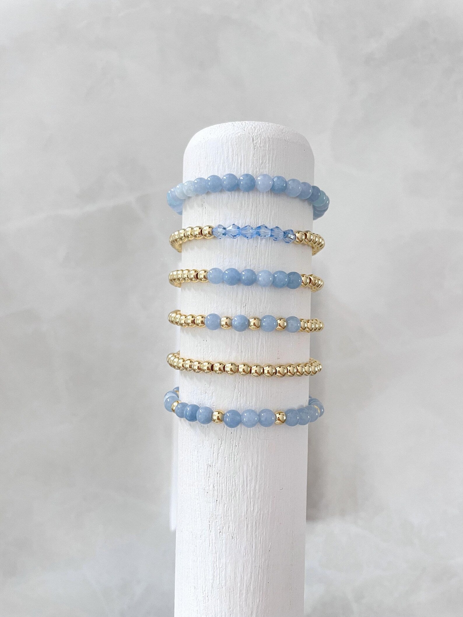 - one bracelet made with 4mm 14k gold plated beads with 4mm aquamarine stone beads