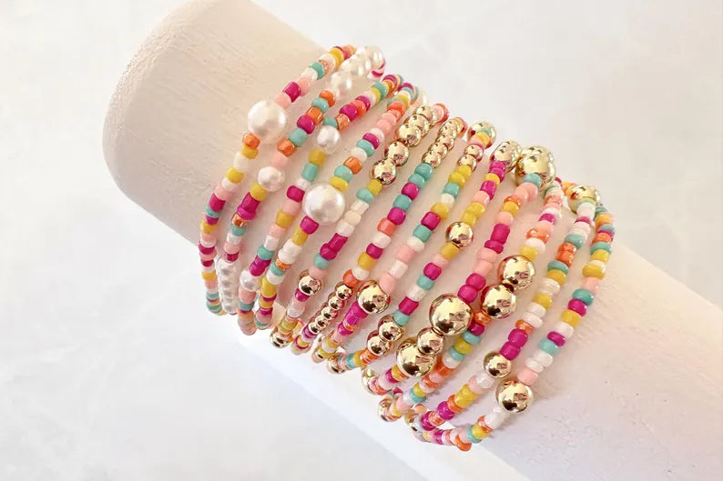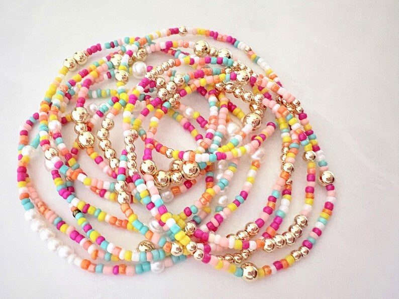 - one 2mm seed bead bracelet made with gold or pearl accent beads.