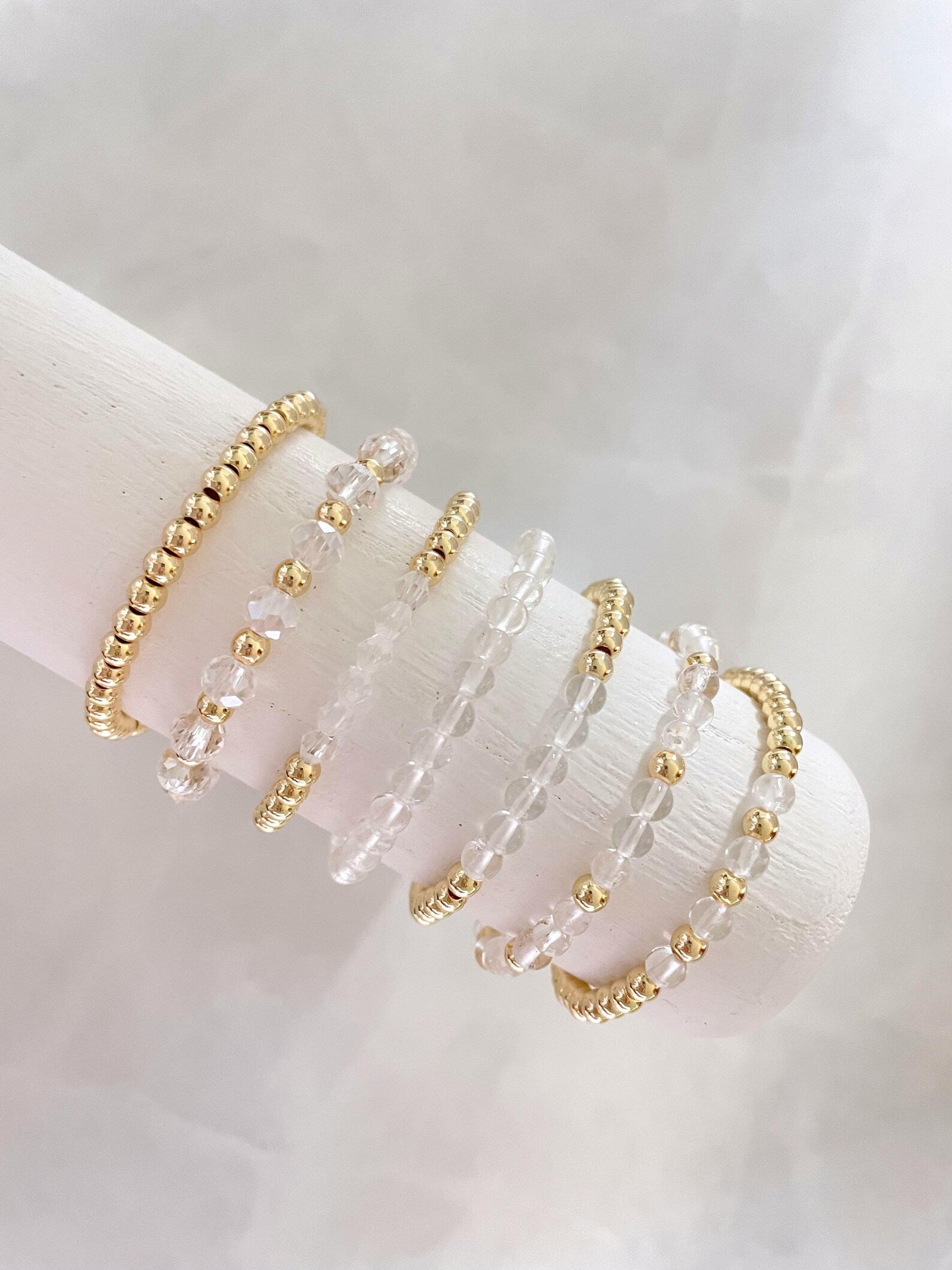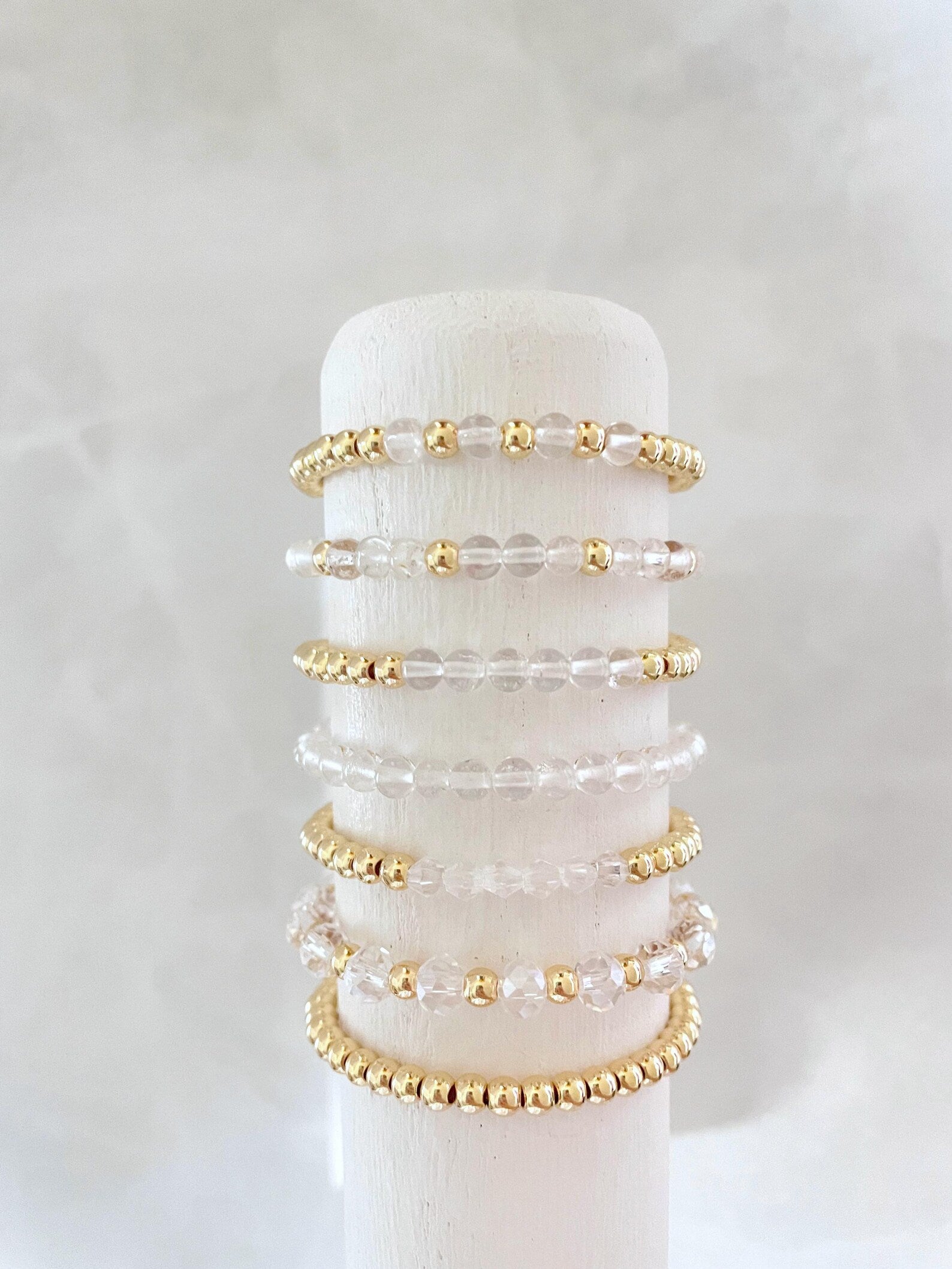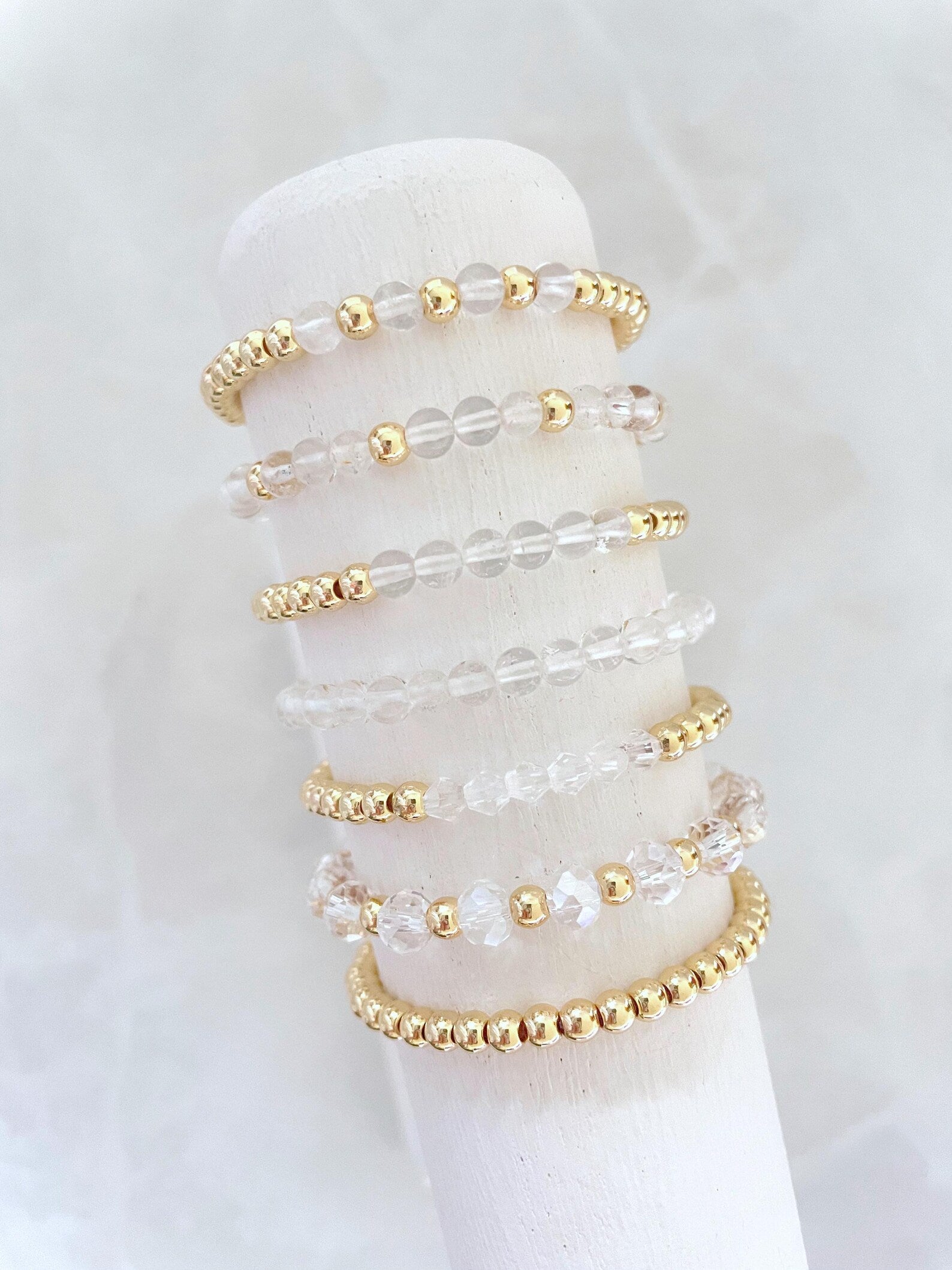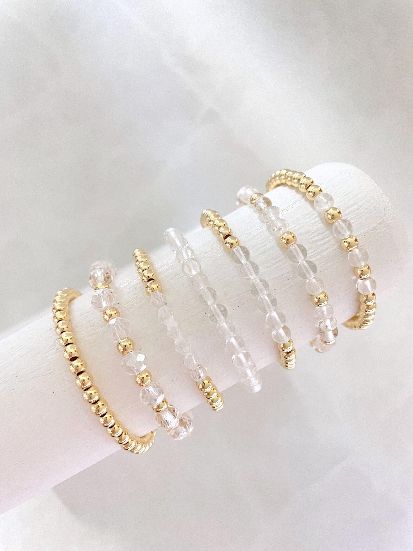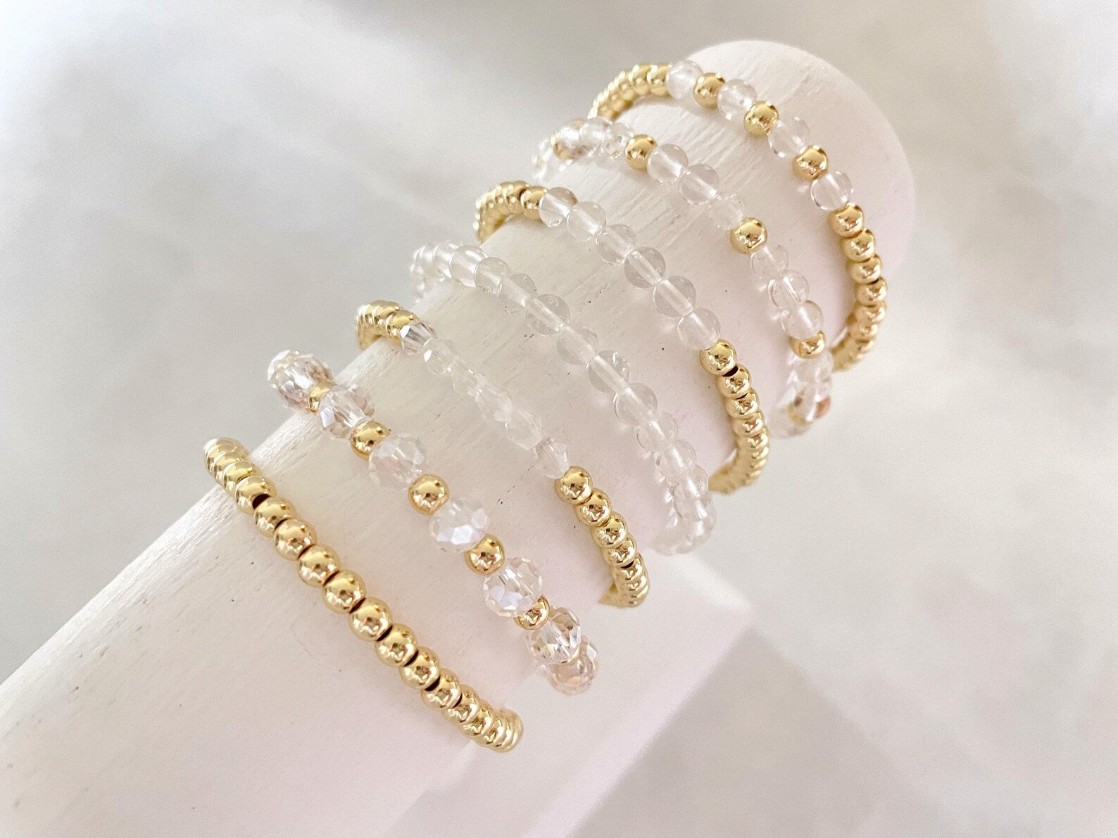 - one bracelet made with 4mm 14k gold plated beads with 4mm clear stone beads