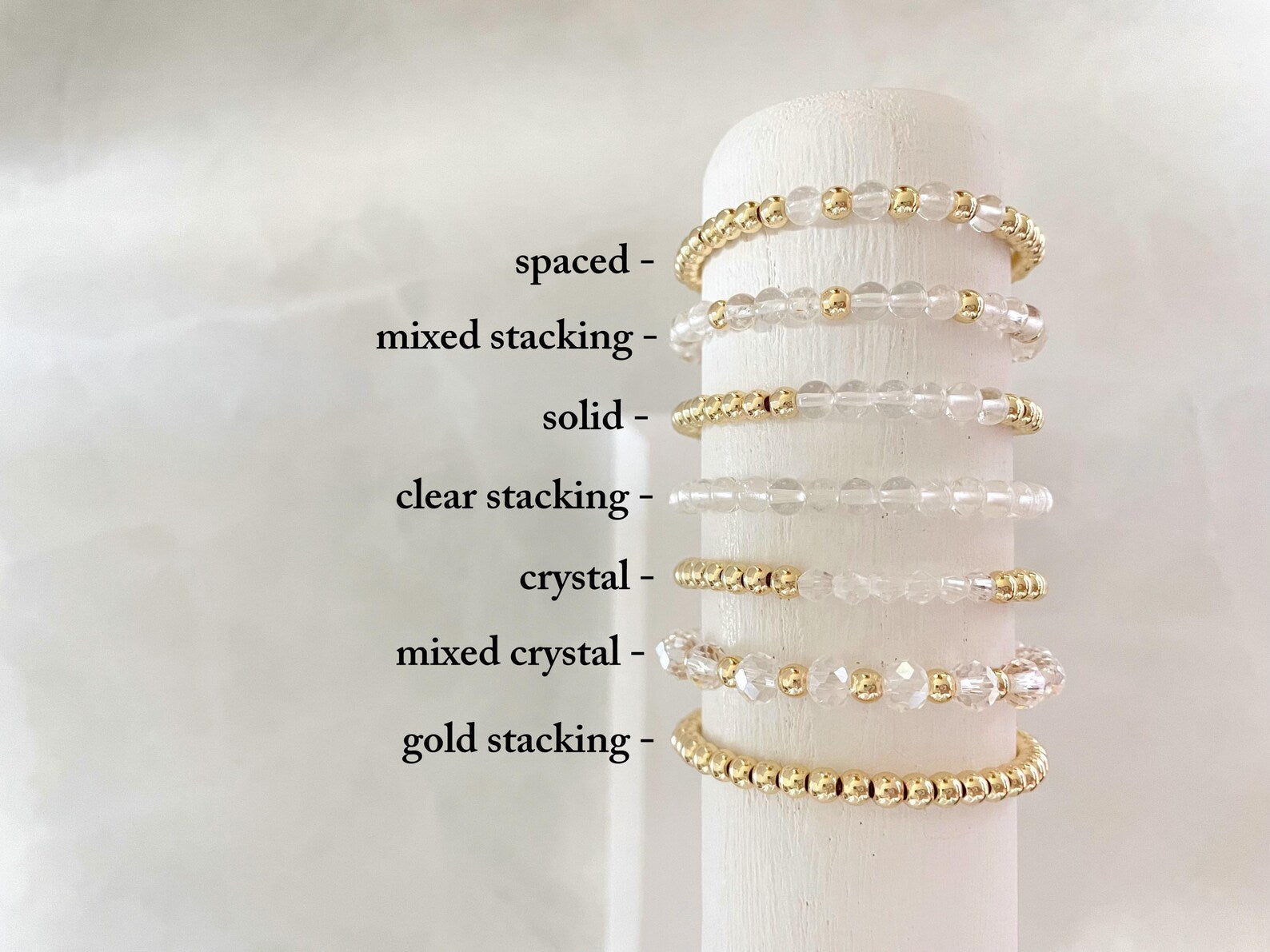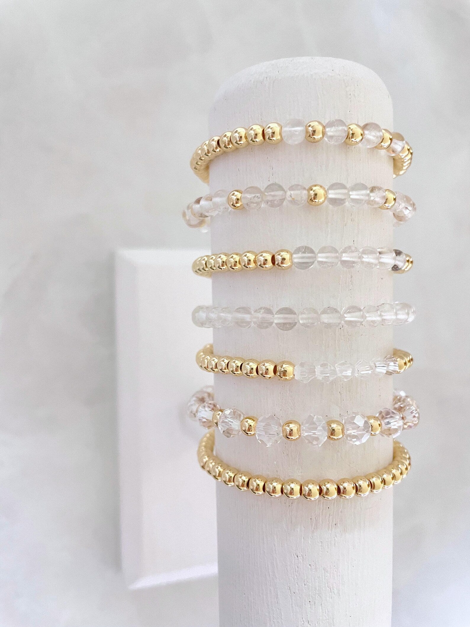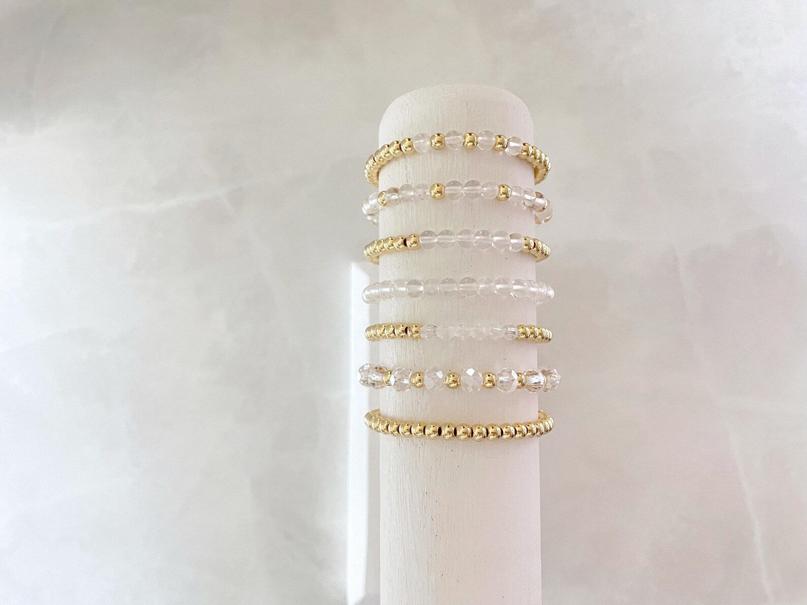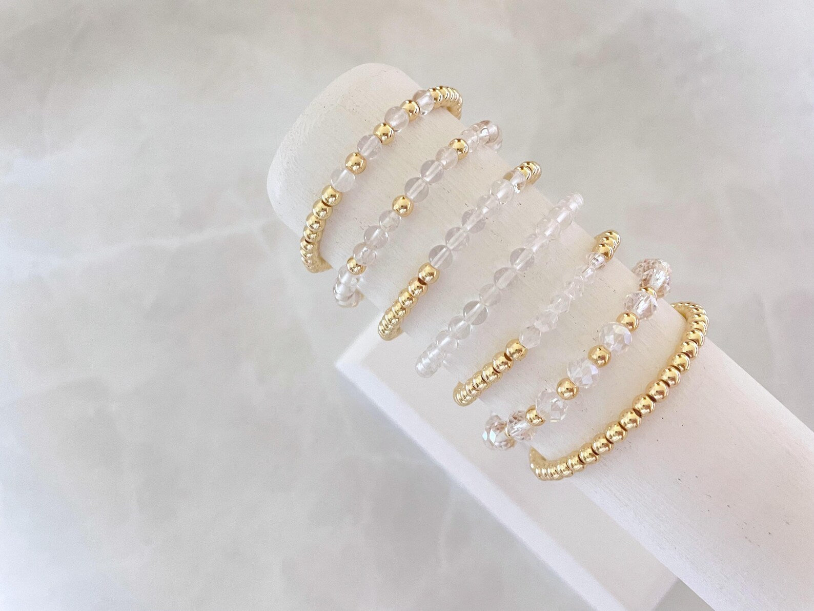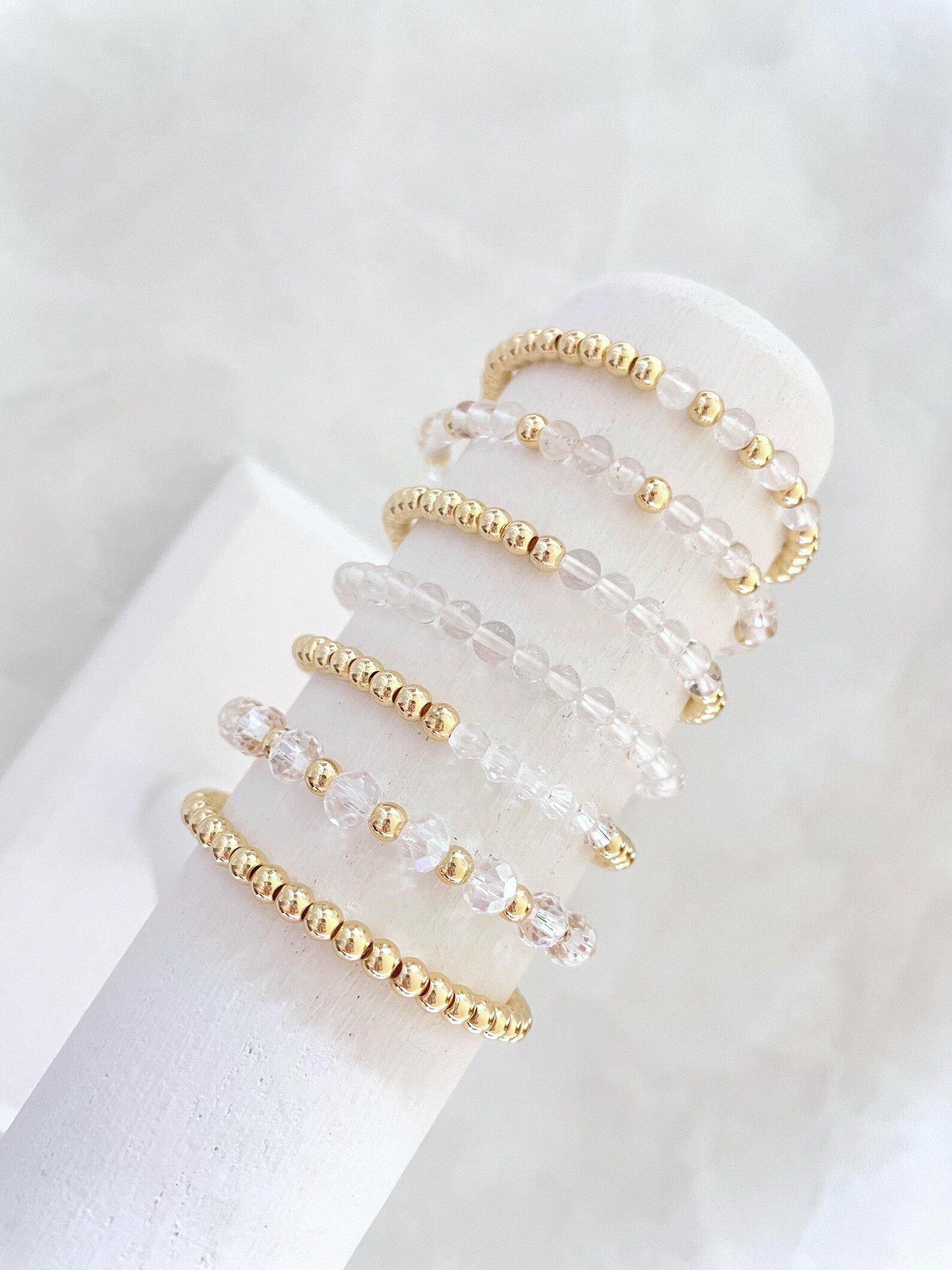 - one bracelet made with 4mm 14k gold plated beads with 4mm clear stone beads