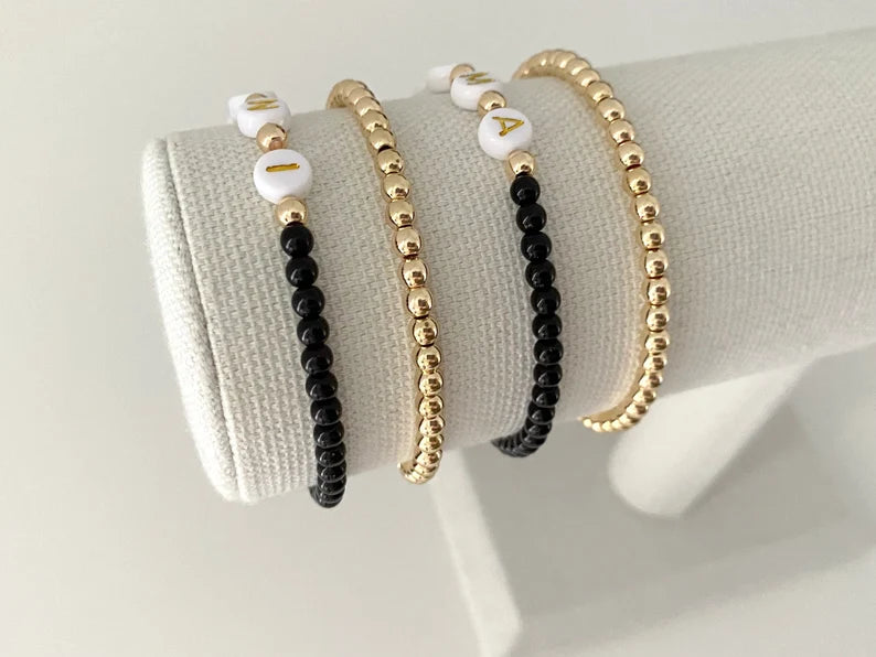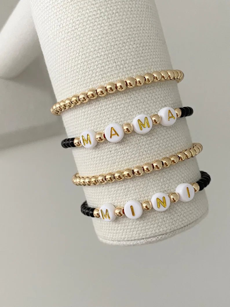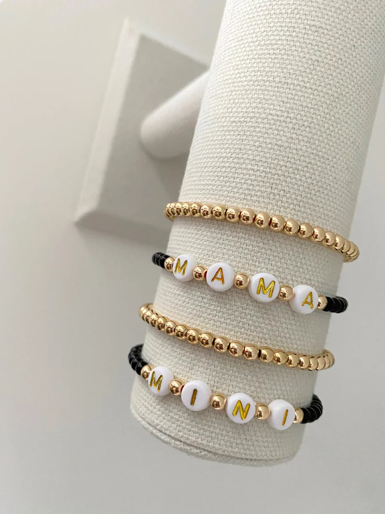 - one mama and one mini matching bracelet made with 4mm black matte beads with 14k gold accent beads
