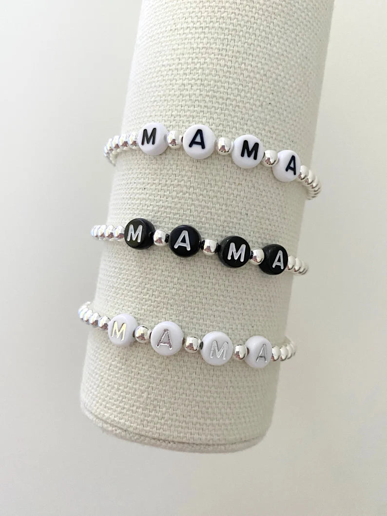 - one mama name bracelet made with 4mm sterling silver plated beads