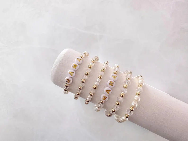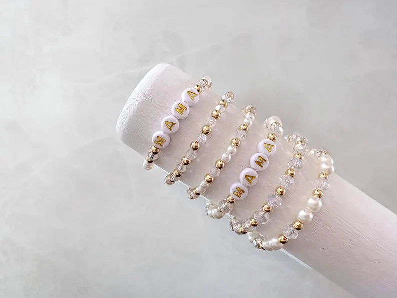 - one bracelet made with 4mm 14k gold plated beads and pearl and crystal accent beads