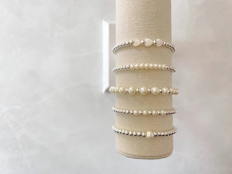 - one beaded bracelet made with 4mm sterling silver beads with pearl accent beads