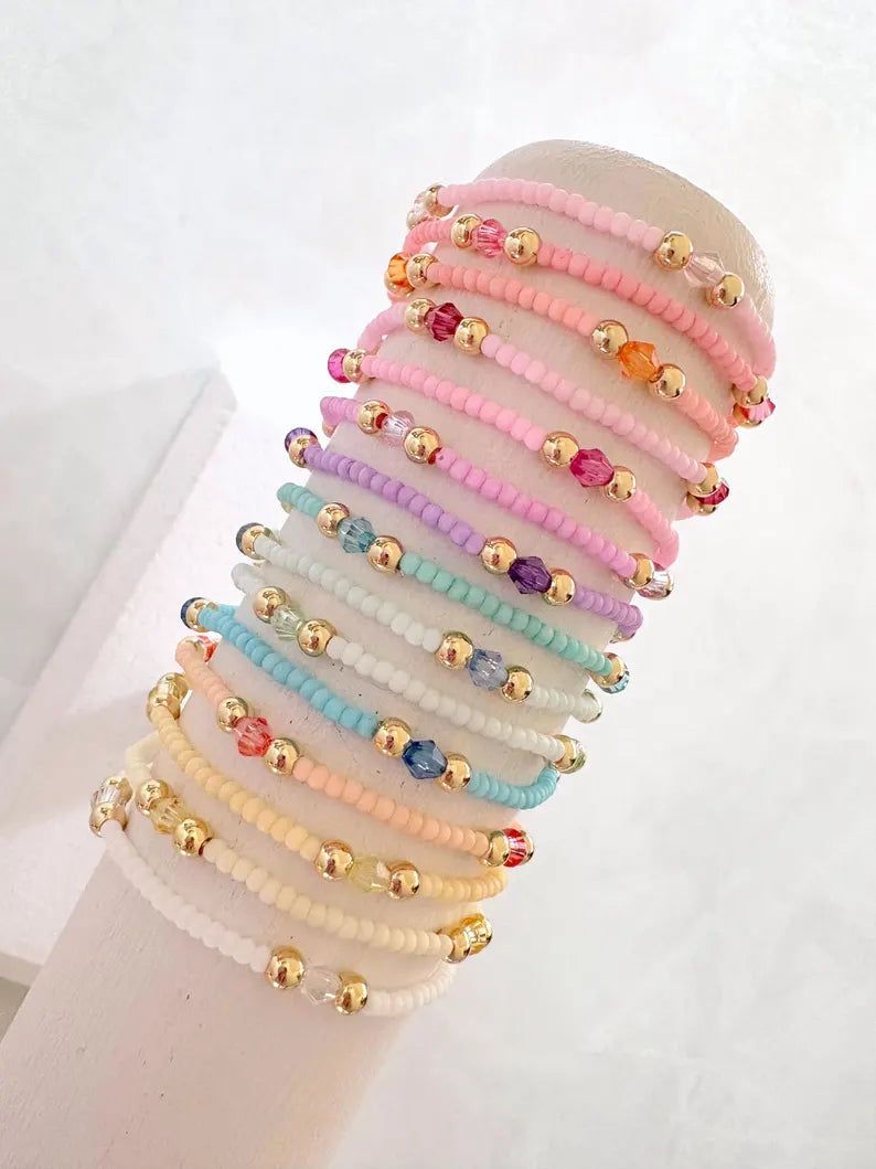 - one beaded bracelet made with 4mm 14k gold plated beads, 2mm seed beads and 4mm crystal accent beads
