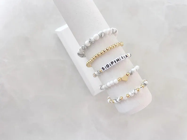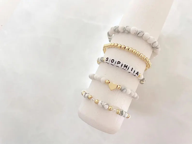 - one bracelet made with 4mm 14k gold plated beads and white howlite stone beads